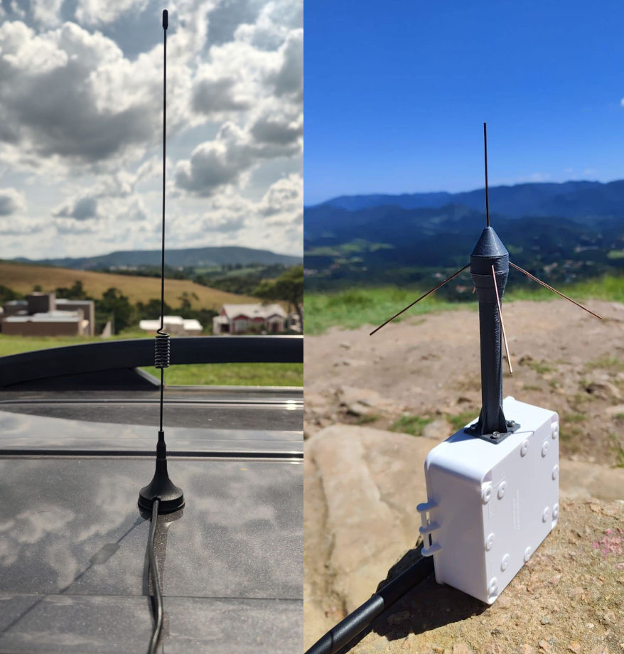 Antena magnética no meu carro (à esq.) e a plano-terra feita pelo Cordeiro (à dir.)